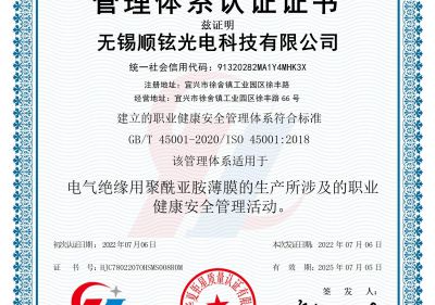 • 無錫順鉉光電職業健康安全管理體系認證證書(S)